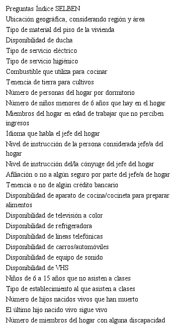 Dado que se requiere replicar el índice SELBEN en la ENEMDU, también se utilizará la ECV de 1999 para homologar las variables entre ambas bases y escalar los ponderadores de estas variables, en el anexo 1 se muestran las variables empleadas para calcular el índice SELBEN en la ECV 1999.