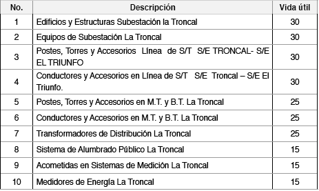 Luego de varios análisis realizados al comportamiento de las diferentes etapas funcionales de los activos del Sistema Eléctrico del Cantón la Troncal de propiedad de la CNEL EP Regional Milagro y de la CENTROSUR CA; referente a la estimación del valor para desmantelamiento, se consideraron algunos parámetros tales como: el estado de conservación del inmovilizado material, la vida útil de los activos, el mantenimiento preventivo y correctivo implementado, la antigüedad del activo, servicio a los usuarios, crecimiento sostenible del sector eléctrico, incremento de proyectos hidroeléctricos, mayor demanda eléctrica en todos los sectores del país, desarrollo socioeconómico de los sectores más distantes, situación geográfica y ubicación del sistema eléctrico, sucesos futuros que puedan afectar al valor necesario para cancelar una obligación originados por cambios en las disposiciones legales, estimación fiable para el cumplimiento de las obligaciones por desmantelamiento, entre otras.