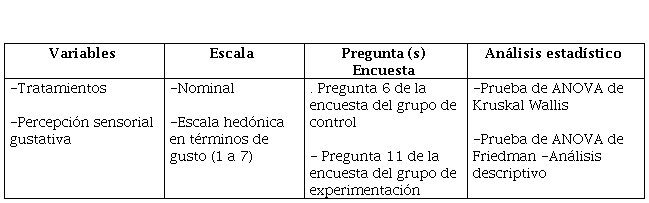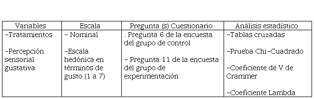 De igual manera para profundizar en este análisis, se realiza la prueba pos hoc de comparaciones entre las percepciones sensoriales gustativas de cada manipulación o tratamiento, éstas se presentan en la tabla 6: