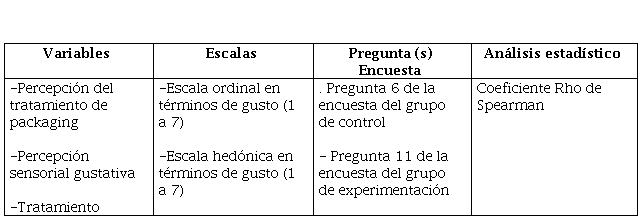 Con un nivel de confianza del 95% y un error de 0,05 se obtiene que el valor p de la prueba estadística es p =0,000; por lo cual se rechaza H0 y se asume H1 la cual establece la no independencia entre la percepción sensorial gustativa y el tipo de packaging. Es decir, se asume la hipótesis del investigador que plantea que la percepción sensorial gustativa guarda algún tipo de relación con el packaging que se presenta al individuo en la experimentación.