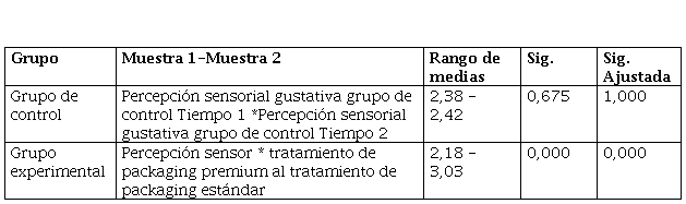 Al mismo tiempo, el resultado de la tabla 5 para el grupo experimental sugiere se asuma H1 la cual determina que las medianas no son las mismas entre las condiciones; al referirse a la hipótesis del investigador, se interpreta como que existe diferencias significativas entre las percepciones sensoriales gustativas que experimentan los centennials con los distintos diseños de packaging. Sin duda este resultado aporta evidencia sobre el efecto que tiene el packaging en las percepciones sensoriales gustativas, puesto que el chocolate que se utiliza en la experimentación es el mismo, la única variante es la presentación, en la cual se utiliza un packaging tipo estándar y otro en estilo premium.