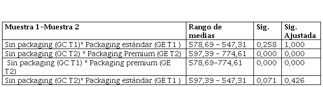En cuanto a los resultados de la comparación del tratamiento de packaging premium y los tratamientos de grupo de control, se obtiene evidencia significativa para rechazar H0 y asumir H1, la cual establece que las medianas no son iguales entre los grupos; en otras palabras, existe diferencias significativas en las percepciones sensoriales gustativas dadas las manipulaciones. Por consiguiente, se entiende que la intervención de un packaging estilo premium tiene efectos diferenciadores en las percepciones sensoriales gustativas de los centennials frente a un chocolate sin packaging.