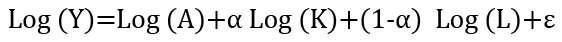 (2)Para hacer que la ecuación (2) sea lineal, aplicamos la función logarítmica e introducimos un término de error ε. Por lo tanto, la ecuación toma esta forma:
