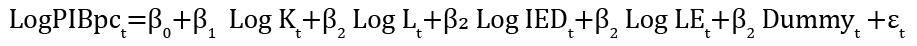 (5)Donde LogPIBpct representa el logaritmo del PIB per cápita en el período t; Log Kt representa el logaritmo de la formación bruta de capital fijo; Log Lt representa el logaritmo de la fuerza laboral; LogIEDt representa el logaritmo de la inversión extranjera directa-entrada neta de capital, deflactada, Log Let representa la libertad económica y Dummyt es una variable exógena que captura el efecto del cambio estructural de la economía como resultado de la crisis económica y financiera, y posterior dolarización de la economía ecuatoriana, este valor toma el valor de 0 antes del año 1999 y 1 desde el año 2000. Es importante destacar que son escasos las investigaciones que toman la libertad económica como una variable en un análisis.