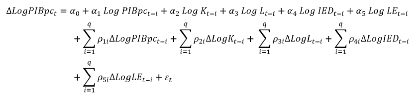 La longitud del rezago del modelo fue determinada con el criterio de información de Akaike (1974), la cual sugiere la utilización de dos rezagos. Consecuentemente se considera el orden de integración de las variables mediante el test de Dickey y Fuller (1979) con el cual se determinó que todas las variables tienen un orden de integración I (1). La ecuación del modelo ARDL se escribe de la siguiente manera: