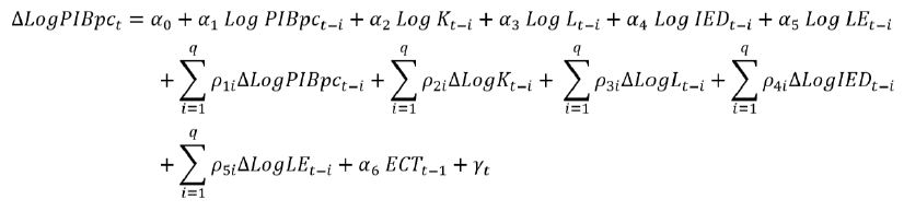 (6)Donde “Δ” denota la primera diferencia de las variables. Para la estimación del modelo de corrección de errores (ECM), se analiza el término de error rezagado (ECT), el cual tiene que ser significativo para verificar la existencia de una relación de equilibrio a corto plazo entre las variables. La ecuación por estimar para el modelo ECM es la siguiente: