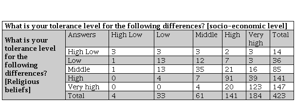 Note that 65% of respondents have a high level of tolerance for religious beliefs and differences in economic status. The relationship between the two factors evidences the sociological aspects of understanding the ways of thinking and institutionalization of beliefs to determine the distribution of income vis-à-vis the moral commitments defined by cults and the distribution of wealth under social principles.
