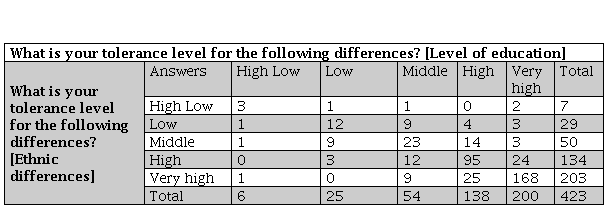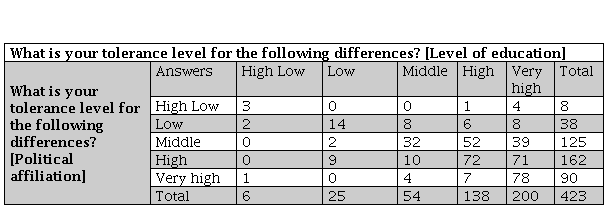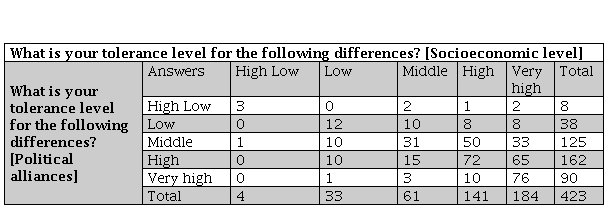 After analyzing, the different variables related to tolerance levels, it is evident that people are less tolerant of the different political affiliations than elements such as educational level, socioeconomic, religious, or ethnic differences present the subjective impact of the endogenous and exogenous characteristics of the research to strengthen the responsibility towards a social change of the population analyzed.