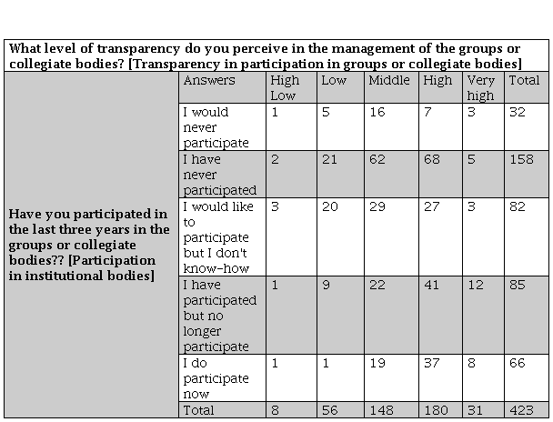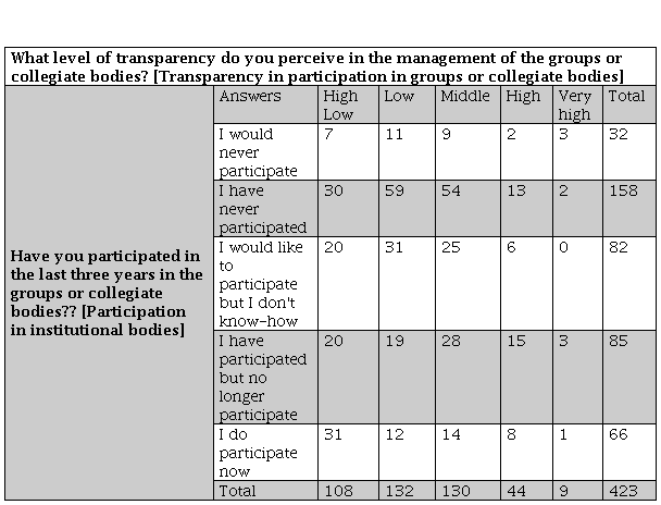 When analyzing the interviewees who have never participated or would never participate in any group or organization within the university, only 25% perceive that the levels of transparency among the directors of these groups are medium or low because the perception is linked to the living conditions evidencing the relationship between the proposals and the decisions of the institutional bodies that evidence their scope and impact.