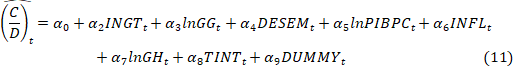 El criterio de información Bayesiano de Schwarz’s (SBIC) se utiliza para determinar el número óptimo de rezagos. Se esperan signos positivos para las variables que representan una demanda adicional de efectivo debido a actividades económicas en la sombra (INGT, DESEM . lnGG). Además, se espera que la variable dependiente rezagada tenga un signo negativo, pues representa el término de corrección de errores.