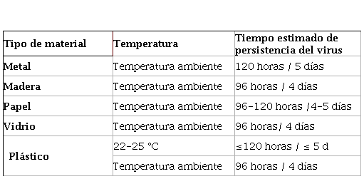 El COVID-19 puede permanecer en superficies de los materiales por varias horas e incluso días (ver tabla N°2), dependiendo de las condiciones ambientales y el tipo de superficie sobre la que se encuentre, en este sentido, resulta fundamental el conocimiento de este particular por parte de los ciudadanos quienes, según los protocolos indicados en líneas anteriores, debían almacenar los residuos previo a la entrega a los recicladores de base.