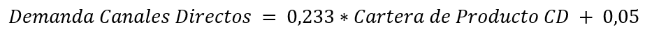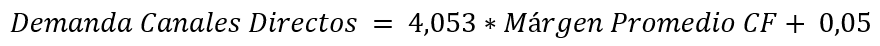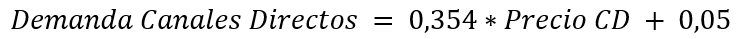 Al medir la relación entre el precio de los canales directos y la demanda, dado un nivel de significancia del 5% y con un valor p = 0,178 se concluye que no existe suficiente evidencia estadística para rechazar la Hipótesis Nula, es decir, no hay correlación entre estas variables. Se determina que la relación entre estas variables es de 0,354.