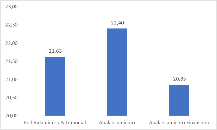 En cuanto al apalancamiento financiero, este se refiere a la capacidad de la empresa para utilizar la deuda como un medio para maximizar los rendimientos para los accionistas. En este caso, el indicador de apalancamiento financiero es de 20,85, lo cual indica que las empresas están utilizando un nivel muy elevado de deuda para financiar sus operaciones. Este enfoque puede ser beneficioso si estas son capaces de generar suficiente retorno sobre la inversión para cubrir los costos de la deuda y proporcionar un rendimiento adicional a los accionistas. Autores como Chicano (2017) destacan que la elección del apalancamiento siempre se presenta como una opción atractiva con diversas ventajas. La clave reside en comprender su aplicación y determinar el nivel de apalancamiento adecuado para evitar posibles desafíos vinculados con la insolvencia en el futuro. Aunque el uso del apalancamiento es siempre una opción viable, se recomienda hacerlo con moderación y precaución. No obstante, es fundamental tener presente que un elevado apalancamiento financiero, según indica Vanilla (2015), también incrementa el riesgo para la empresa, ya que cualquier reducción en los ingresos podría dificultar el cumplimiento de los pagos de intereses de la deuda.