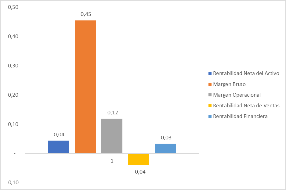 Además, el margen bruto del 45% indica que estas empresas lograron obtener una ganancia significativa de sus ingresos por ventas, después de deducir los costos directos relacionados con la producción y la venta de sus productos o servicios. Sin embargo, el margen operacional disminuye a un 12% por todos los gastos generados, y en un 16% para la rentabilidad neta de ventas, generando un índice de -4%, lo que indica que los intereses e impuestos generados en ese intervalo superan en gran medida al margen operacional, generando finalmente pérdidas en relación con sus ingresos por ventas, (es importante recalcar que la gran mayoría generaron utilidades, sin embargo, una de las empresas más importantes registró una perdida significativa, lo cual hace que el índice general disminuya y sea negativo). Esto puede deberse a varios factores, como la ineficiencia en la gestión de costos y gastos, la falta de diversificación en sus actividades comerciales o la dependencia excesiva de las contrataciones estatales como fuente principal de ingresos, esto está relacionado con el riesgo económico y financiero que menciona Mascareñas (2008).