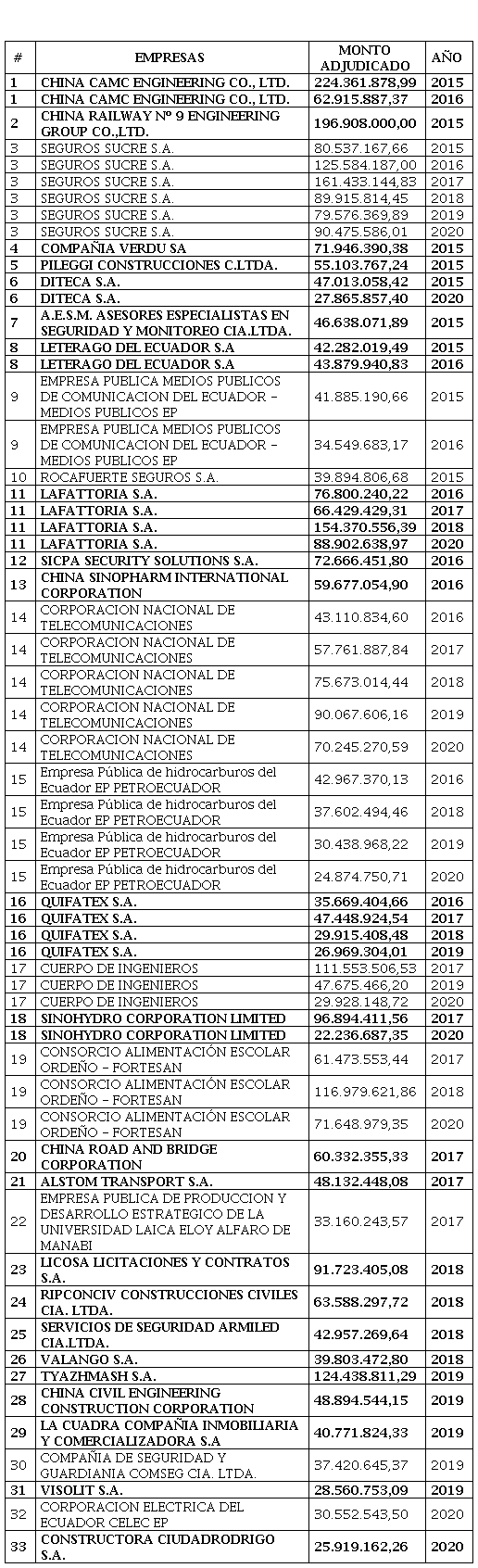 En conclusión, el análisis de los datos muestra que la Contratación Pública en el Ecuador durante los períodos 2015 al 2020 involucró principalmente a empresas nacionales, con una presencia significativa de empresas extranjeras, especialmente chinas; lo que hace que sea importante continuar monitoreando esta dinámica en el futuro para evaluar su impacto en la economía y el desarrollo del país.