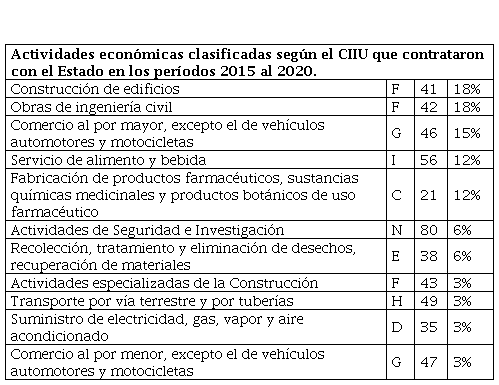 Las actividades económicas principales de las empresas que contrataron con el Estado Ecuatoriano durante los períodos 2015 al 2020, de acuerdo con la Clasificación Industrial Internacional Uniforme de Todas las Actividades Económicas (CIIU) Nivel 2, son las siguientes: construcción de edificios y obras de ingeniería civil, cada una con un 18% del total. Además, el comercio al por mayor, excepto el de vehículos automotores y motocicletas, representó un 15%, mientras que el servicio de alimentos y bebidas y la fabricación de productos farmacéuticos, sustancias químicas medicinales y productos botánicos de uso farmacéutico representaron un 12% cada uno. Las actividades de seguridad e investigación y la recolección, tratamiento y eliminación de desechos, recuperación de materiales cada una representaron un 6%; mientras que otras actividades como el transporte por vía terrestre y por tuberías, suministro de electricidad, gas, vapor y aire acondicionado, comercio al por menor, excepto el de vehículos automotores y motocicletas y actividades especializadas de construcción, representaron un 3% cada una. Estos hallazgos sugieren que las empresas que contratan con el Estado Ecuatoriano se dedican principalmente a actividades de construcción e ingeniería, así como a actividades comerciales, alimentarias y farmacéuticas, ya que estas cubren más del 75% sobre el total. Para mayor detalle sobre la clasificación del CIIU nivel 2 revisar la Tabla 3.