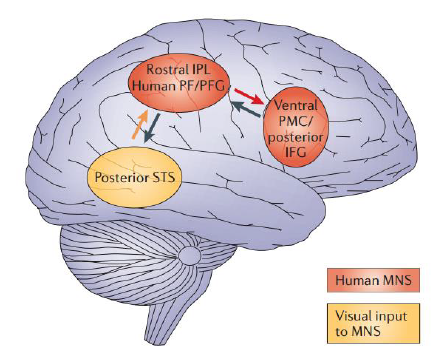 Diversos estudios de neuro imagen, sugieren la existencia de un sistema de neuronas espejo en humanos, se encuentra una investigación activa que relaciona el tema de la influencia de las áreas de neuronas espejo y diversos procesos sociales tales como comprensión de intenciones y emociones de otras personas (Iacoboni, 2006) ; este autor propone entonces, la existencia de un sistema de neuronas denominadas neuronas espejo o MNS (Siglas en ingles), las cuales tienen como función el análisis de las acciones, emociones y procesos cognitivos que permiten la imitación y posterior aprendizaje.