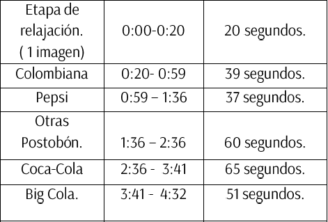 La distribución de tiempo por cada comercial y su orden se determina en la siguiente tabla; Cabe denotar que el orden de los comerciales fue escogido aleatoriamente.
