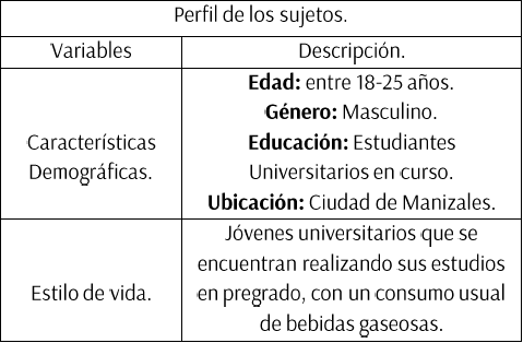 En el estudio se analizará el comportamiento de dos grupos de personas conformado cada uno por 10 sujetos. Los grupos de prueba se denominarán grupo de control y grupo experimental, en donde el grupo experimental será expuesto a diversos estímulos como la acción de ver a otro individuo consumiendo una bebida gaseosa, estímulos que permiten la activación del sistema de neuronas espejo (Schulkin, 2000). Los resultados obtenidos por el primer grupo serán contrastados por el grupo control en el cual no se incluirá el estímulo, para así determinar la influencia de este en el proceso de toma de decisión y posterior consumo.