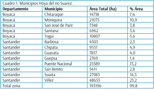 Los municipios de la Hoya del rio Suárez están contenidos en el cuadro 1.