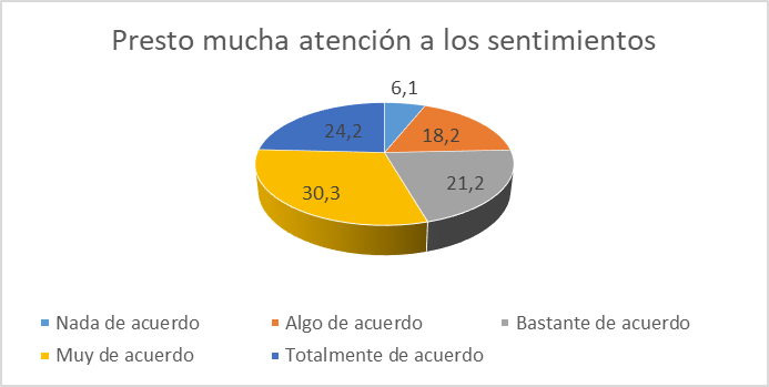 En cuanto a la atención de los sentimientos, el 24,2% de las personas expresaron que están totalmente de acuerdo con este aspecto, sin embargo, el 30,3% afirmo que está muy de acuerdo, 21,2% bastante de acuerdo, mientras el 18,2% dice estar nada de acuerdo y el 18,2 está algo de acuerdo.