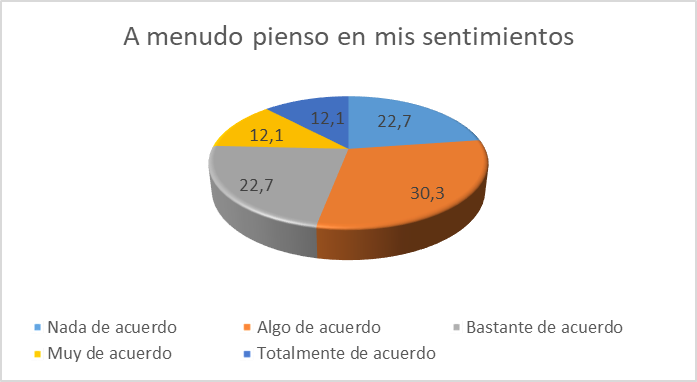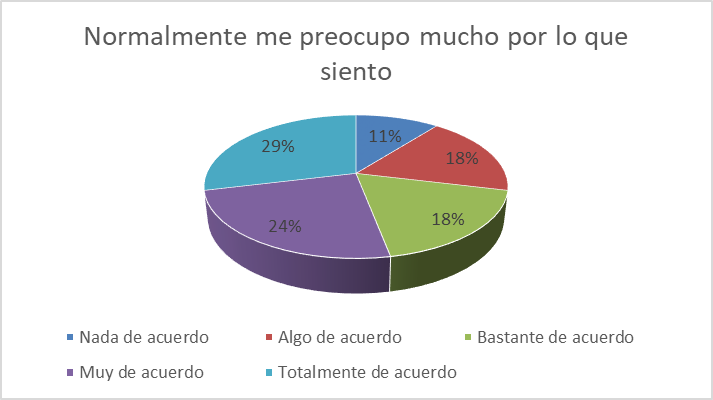 Por otra parte, el 28,8% de la población encuestada está totalmente de acuerdo en mantener una preocupación pos sus sentimientos, sin embargo, el 24,2% muy de acuerdo, 18,2 bastante de acuerdo, 18,2% algo de acuerdo, mientras que el 10,6% opina todo lo contrario.