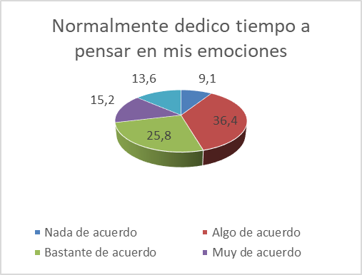 Al indagar si los individuos dedican tiempo a pensar en sus emociones, se observó que el 28,8% dice estar muy de acuerdo y totalmente de acuerdo con este aspecto; sin embargo, el 62,2% dice estar entre bastante y algo de acuerdo, mientras el 9,1% se encuentra nada de acuerdo con la afirmación.