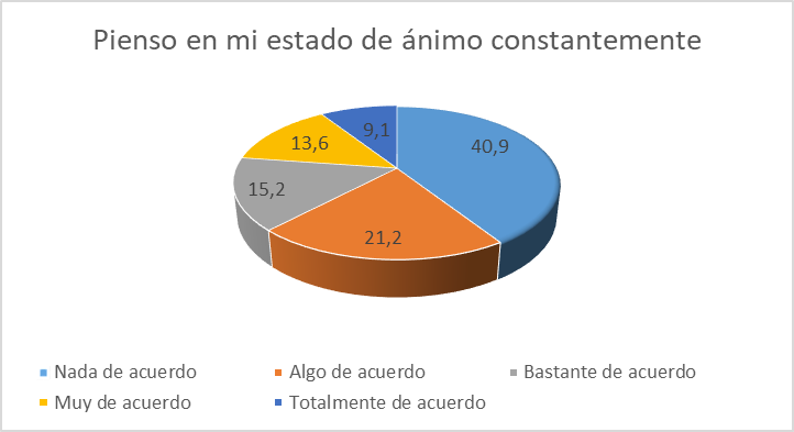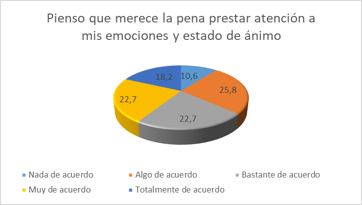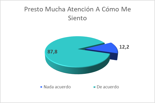 En cuanto a la afirmación presto atención a mis emociones y estado de ánimo, el 63,6% dice estar algo, bastante y muy de acuerdo con la afirmación, mientras el 10,6% se mostró nada de acuerdo.