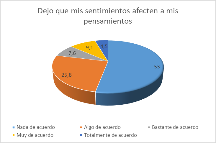 De otro lado el 53% dice que sus sentimientos no afectan sus pensamientos, mientras el 25,8% está algo de acuerdo, 7,6% bastante de acuerdo, 9,1% muy de acuerdo, 4,5% totalmente de acuerdo.