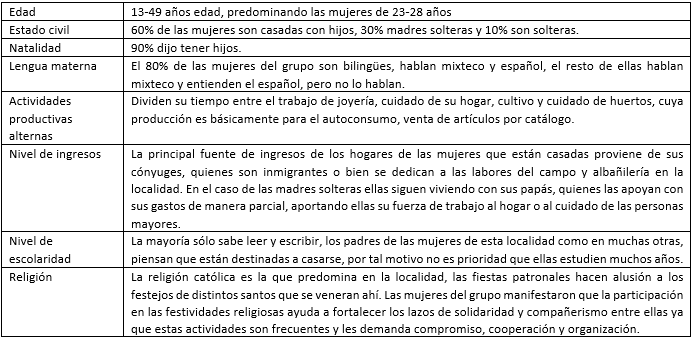 De las tres colaboradoras, dos de ellas son también originarias de la localidad de Santo Domingo Tonalá, por lo que conocen la situación de pobreza por la que pasan varias mujeres de este lugar. La tercera persona es originaria del Municipio de Soledad Etla, Oaxaca, en el momento en que se le planteo participar en este proyecto, se desempeñaba como presidenta municipal de este lugar, por lo que siente empatía por apoyar a grupos sociales que viven en pobreza. Actualmente las cuatro mujeres residen en diferentes lugares del estado de Oaxaca[6]. Ellas tienen como características el compromiso social, la solidaridad, la colaboración, el trabajo en equipo y valores fundamentales en la concepción de un grupo de trabajo, esto les permitió concretar una propuesta para las mujeres del Municipio, en la cual encontrarían una manera de emplearse, en donde espacio y tiempo son verdaderos puntos cruciales para que ellas puedan participar en una actividad productiva.