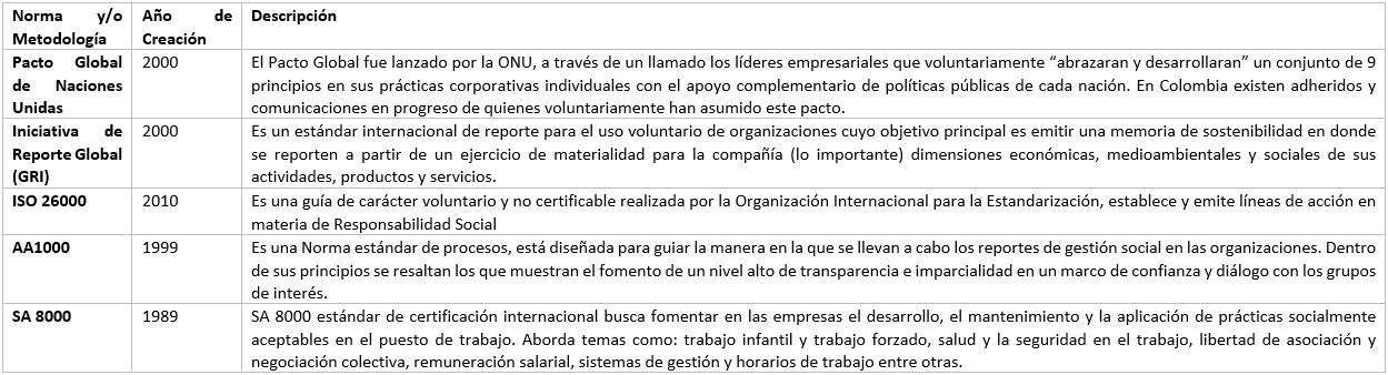 Dadas las exigencias, interés y presión que sobre las empresas se ha generado por parte de algunos grupos de interés, a partir de los noventa, diferentes compañías empezaron a elaborar informes que incluyeran en su contenido resultados de sus acciones sobre las dimensiones ambientales y sociales de su quehacer y que soporten de alguna manera la triple cuenta de la sostenibilidad. De forma simultánea grupos alternos de organizaciones sociales, académicos, investigadores, organizaciones de la sociedad civil y entes gubernamentales se preocuparon por desarrollar diferentes metodologías de medición y socialización de resultados en términos de RSE, de ahí que actualmente existan diferentes formas de medir el comportamiento en materia de responsabilidad social de las empresas. De manera que a hoy día se cuenta con un número importante de herramientas y metodologías entre las que se encuentran entre otros: el Pacto Global, El GRI versión G4 (Global Reporting Initiative) y la Norma ISO 26000, que tienen efecto sobre los comportamientos económicos de las compañías que cotizan en bolsa y que se rigen por el Indicador bursátil Dow Jones, que requiere para su calificación la generación de informes de sostenibilidad bajo algún estándar internacionalmente reconocido.