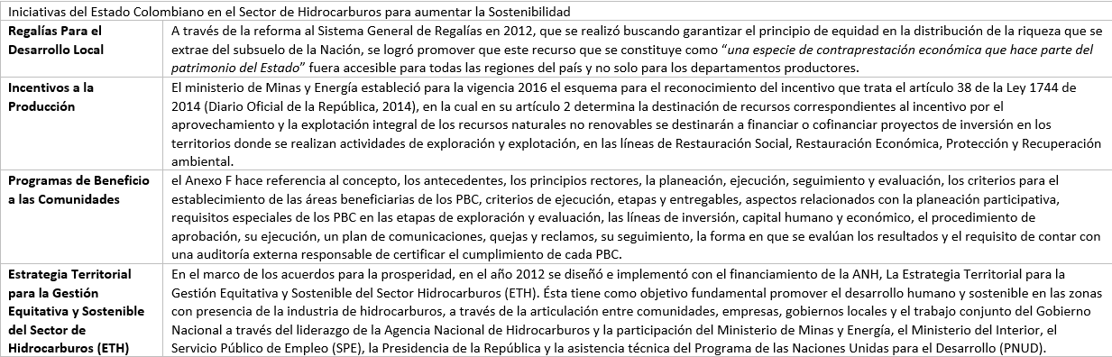 Para el sector de hidrocarburos también se han realizado y/o adaptado estas herramientas de medición y pactos de adherencia en búsqueda de la sostenibilidad; la metodología GRI a partir de su versión G3 cuenta con un suplemento dirigido específicamente al sector Oil & Gas y muchas de las compañías operadoras y empresas nacionales generan sus memorias de sostenibilidad bajo la metodología GRI o han suscrito la adherencia al pacto global. Ante esto, una de las estrategias del gobierno colombiano es la de fortalecer institucionalmente al sector de hidrocarburos y que desde esta fortaleza institucional se generen alternativas que permitan la viabilidad de explorar y explotar crudo en más regiones del país en un proceso de post acuerdo de paz.