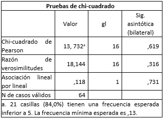 Con un nivel de significancia del 5% y un grado de libertad de 16 según la tabla de valores de chi cuadrado, teniendo un valor límite de 26,296, y de acuerdo al análisis realizado que arrojo un chi cuadrado de 13,732, se demuestra que la hipótesis nula para estas dos variables es aceptada.
