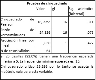 Con un nivel de significancia del 5% y un grado de libertad de 16 según la tabla de valores de chi cuadrado, teniendo un valor límite de 26,296, y de acuerdo al análisis realizado que arrojo un chi cuadrado de 18,225, se demuestra que la hipótesis nula para estas dos variables es aceptada.