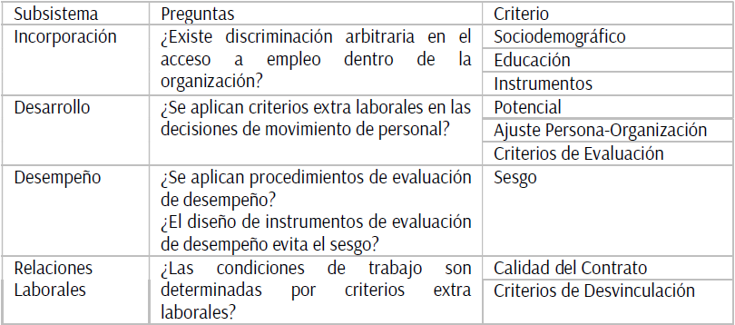 En el caso del subsistema de incorporación, los criterios de selección harán frente tanto a la configuración del mercado laboral como a las necesidades internas de las organizaciones. Lo anterior implica determinar bajo qué condiciones la decisión de incorporación a la organización responde a criterios arbitrarios o extra laborales. Para ello existen diferentes criterios que pueden dar cuenta de conductas arbitrarias, como es el caso de la inclusión de criterios relacionados con características sociodemográficas, la educación de los candidatos o los mismos instrumentos utilizados para evaluar las habilidades de los postulantes.