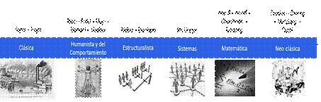 Es relevante conocer cuál ha sido el recorrido a través de la historia del pensamiento administrativo y gerencial (Figura 1) con el objetivo de identificar las tendencias con las que direccionamos hoy nuestras organizaciones, las cuales enmarcan el proceso de gestión de recursos y del trabajo con las personas en las mismas. De las diferentes teorías existentes, revisamos las generalidades de las principales escuelas, esperando con ello evidenciar y relacionar las características en las empresas de la región antioqueña al hacer el análisis de la estructura empresarial de este sector colombiano.
