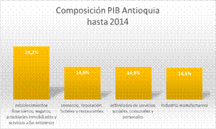 En años recientes, se encuentra que la estructura industrial en 1980 tiene un peso exageradamente alto en bienes de consumo y bajo en los demás sectores. El nivel actual de participación en Colombia o América Latina no es muy diferente hoy al de los países de la OECD (18.6%) o al de la economía mundial (18.8%). Según la Cámara de Comercio de Medellín, la composición del PIB de Antioquia hasta 2014, se encuentra discriminado en las siguientes actividades de mayor participación en la producción del Departamento: