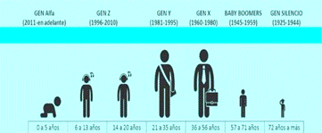 Las generaciones humanas se refieren al perfil de personalidad que tienen en común las personas nacidas en un mismo período de tiempo, las cuales se ven influenciadas por condiciones políticas, económicas y sociales similares (este período normalmente es de 20 años). Los gerentes de las organizaciones de hoy y, en especial los gerentes de gestión humana, no pueden seguir liderando a las personas de la misma manera que lo hacían hace 30 años. En la actualidad, convivimos 6 generaciones lo que hace que se requieran distintas formas de relacionarnos y de direccionarnos para lograr los objetivos individuales y de equipo. Para esto, es necesario conocer las características de cada generación (Figura 4) y sus motivaciones.