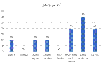 Respecto al sector empresarial (Figura 8), aunque la industria manufacturera sigue liderando en la región (30%), otros sectores de interés compiten cercanamente como la tecnología (20%) y los servicios a personas (salud y educación) (20%).