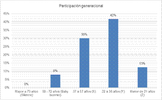 En las empresas encuestadas, se observa la interacción de al menos 4 de las 5 generaciones aptas para trabajar (Figura 10). La generación Y representa el mayor porcentaje de participación con un 42%, sin embargo, la X sigue de cerca con una diferencia de 12 puntos porcentuales (30%). En los extremos encontramos a las generaciones Baby boomer y Z con sólo 4 puntos de diferencia entre ellas. No se observaron empleados de la generación silencio.