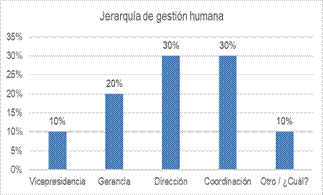 En la mayoría de las organizaciones (Figura 12) donde trabajan las personas encuestadas, el área de gestión humana está ubicada en nivel medio (táctico) ya sea liderada desde una dirección o una coordinación (60%). El 30% de las empresas analizadas tienen ubicada a gestión humana en un nivel estratégico, gerencia o vicepresidencia.