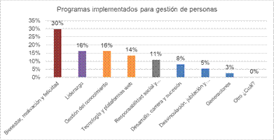 Más del 80% de los programas implementados en las organizaciones están dirigidos a mejorar condiciones que le apuntan al presente laboral de los empleados de la compañía, siendo la actividad más representativa aquella relacionada con el bienestar, la motivación y la felicidad (30%). Le siguen casi a la mitad, 16%, los programas de liderazgo y de gestión del conocimiento, así como las tecnologías y plataformas web (14%). A pesar del énfasis legal y de comunidad, el 11% de las empresas que hacen parte de la encuesta tienen implementados programas relacionados con la responsabilidad social y la sostenibilidad. Lo que más falta desarrollar e implementar tiene que ver con el futuro de los empleados en la organización y fuera de ésta (16%): planes de desarrollo, carrera y sucesión (8%), desvinculación, jubilación y pensión (5%), y gestión de generaciones (3%) como se evidencia en la Figura 14.