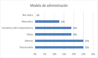 Como se muestra en la Figura 15, más del 80% de las personas encuestadas perciben que el modelo de administración que funciona en su compañía actualmente está dentro del grupo de escuelas que propusieron sus principios teóricos hasta los años 60, en el siglo XX: modelo estructuralista (25%), sistemas (25%), clásico (19%), y humanista y del comportamiento (19%).