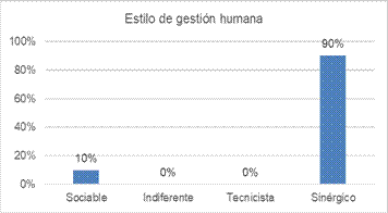 El estilo de gestión humana identificado por los encuestados (Figura 17) es en su mayoría Sinérgico (90%), presentando un alto énfasis en las tareas y alto énfasis en las personas. El otro estilo que identifican es el sociable (10%). Los otros dos estilos del modelo no se evidencian por parte de los participantes en el estudio.