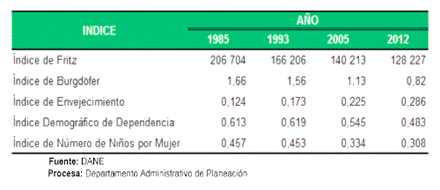 Se observa en la Tala 2 que el Índice de Envejecimiento viene incrementándose y que para el año 2005 alcanzó a ser casi el doble de 1985. Actualmente, por cada 100 antioqueños menores de 20 años, existen 29 adultos mayores de más de 65 años, mientras que en 1985 se contabilizaban solo 12. Frente al índice de niños por mujer en edad fecunda que se observa en descenso sostenido, se espera que continúe siendo menor en la medida en que se implementen más programas de acceso y uso a los métodos de planificación familiar, y como efecto indirecto de que más mujeres antioqueñas accedan a la educación superior y al mercado laboral como mano de obra calificada, porque con ello continuarán retardando la edad para tener sus hijos y el número de hijos deseados.