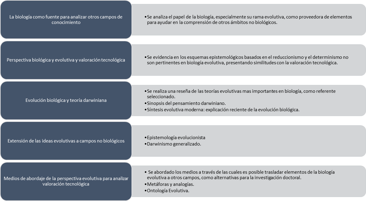Finalmente, Jiménez (2017) sintetiza para la valoración tecnológica las posibilidades desde la biología, en donde propone como la biología puede tener un papel de comprensión y las posibilidades de la aplicación biológica evolutiva y tecnológica, que se observa en la Figura 1.