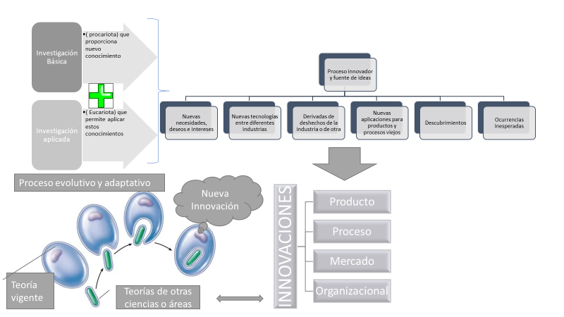Finalmente, la propuesta de aplicación metafórica se proporciona en la Figura 2; en ella, se propone que la investigación básica y aplicada permitan integrarse con los nuevos conocimientos a partir del proceso de innovación que debe permitir reunir las diferentes teorías de diferentes áreas, ciencias, unidades organizaciones e incluso empresas en las diferentes innovaciones que se requieran dentro del entorno organizacional.