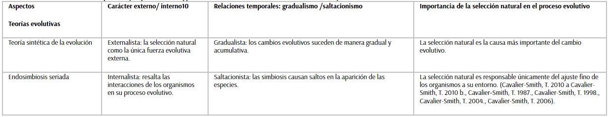 Chavez (2013) propone un paralelo conceptual para diferenciar la endosimbiosis como proceso de la teoría sintética de la evolución, que se observa en la Tabla 5.
