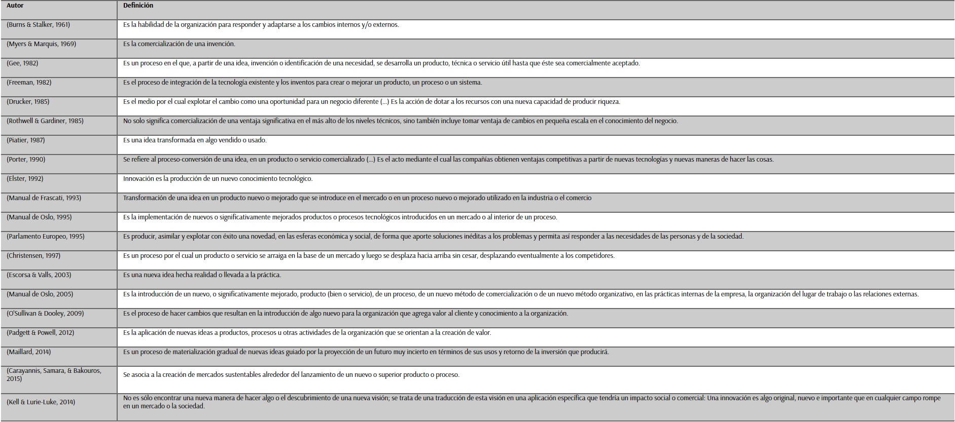 Los procesos de innovación al interior de las organizaciones han sido vistos desde muchas alternativas, considerando siempre su papel protagónico en el desarrollo no sólo de las organizaciones sino de los países en general (Chandra & Primo, 2009). Sin embargo, es difícil encontrar un consenso acerca de lo que significa y cuál es el camino apropiado para inducirla. La Tabla 1 propone diferentes alternativas de la definición de Innovación.