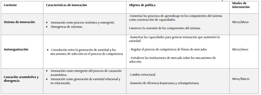 La innovación vista como un proceso biológico también es presentado por Yoguel, Barletta & Pereira (2017), ellos proponen las corrientes de la innovación observadas en la Tabla 4.